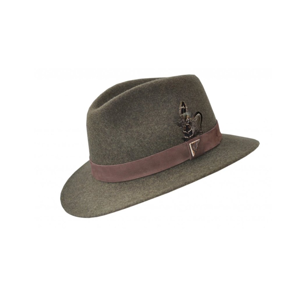 Myslivecký klobouk Albert, 100% vlněná plsť, zdobený koženým páskem s aplikací z parohoviny a svazkem bažantích pírek. Textilní potní pásek Werra Hunting.