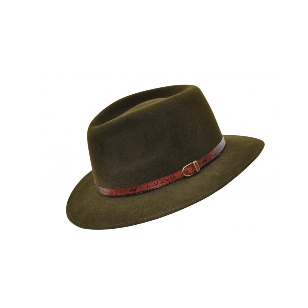 Myslivecký klobouk Astor, 100% vlněná plsť, zdobený jemným koženým páskem s kovovou přezkou, textilní potní pásek Werra Hunting.