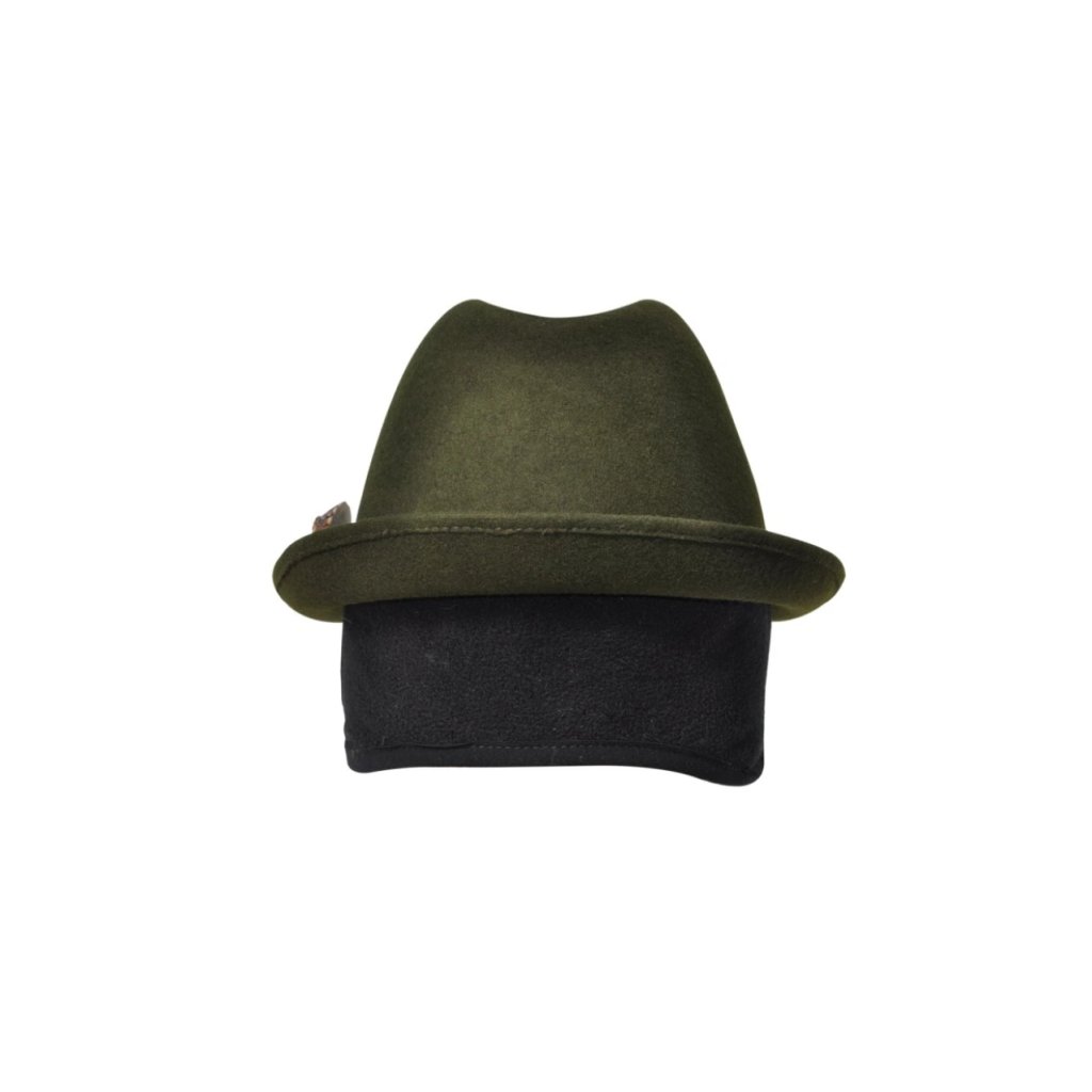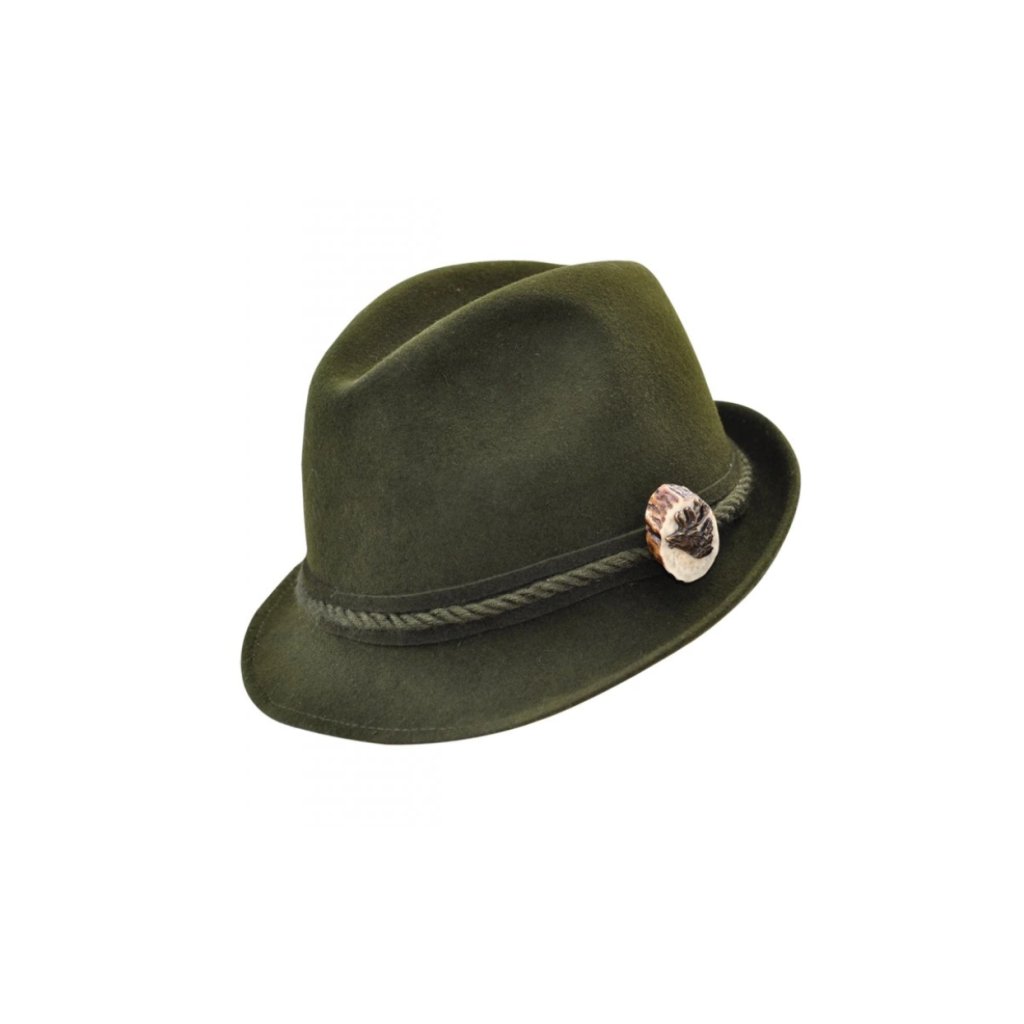 Myslivecký klobouk Henry, 100% vlněná plsť, speciálně vybaven nátylníkem z větru odolného materiálu NO WIND, zdobený splétanou bavlněnou šňůrou a oválem řezaného parohu s emblémy zvěře. Textilní potní pásek Werra Hunting.