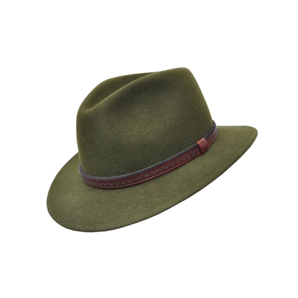 Myslivecký klobouk Oliver, 100% vlněná plsť, zdobený páskem v kombinaci kůže a textilní pásek. Textilní potní pásek Werra Hunting.