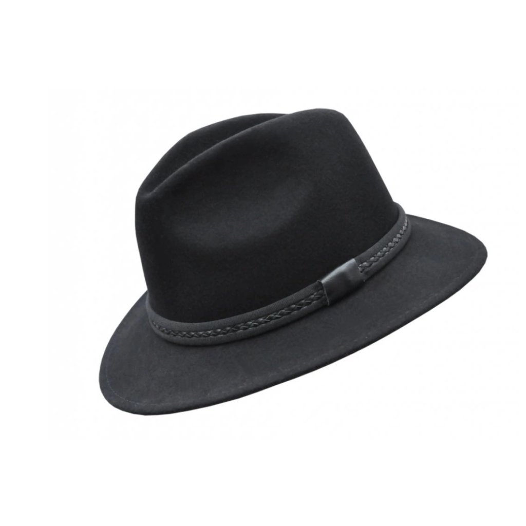 Vycházkový klobouk Aram, 100% vlněná plsť, černý, zdobený splétaným koženým páskem, v kombinaci s textilní paspulí. Textilní potní pásek Werra Hunting.